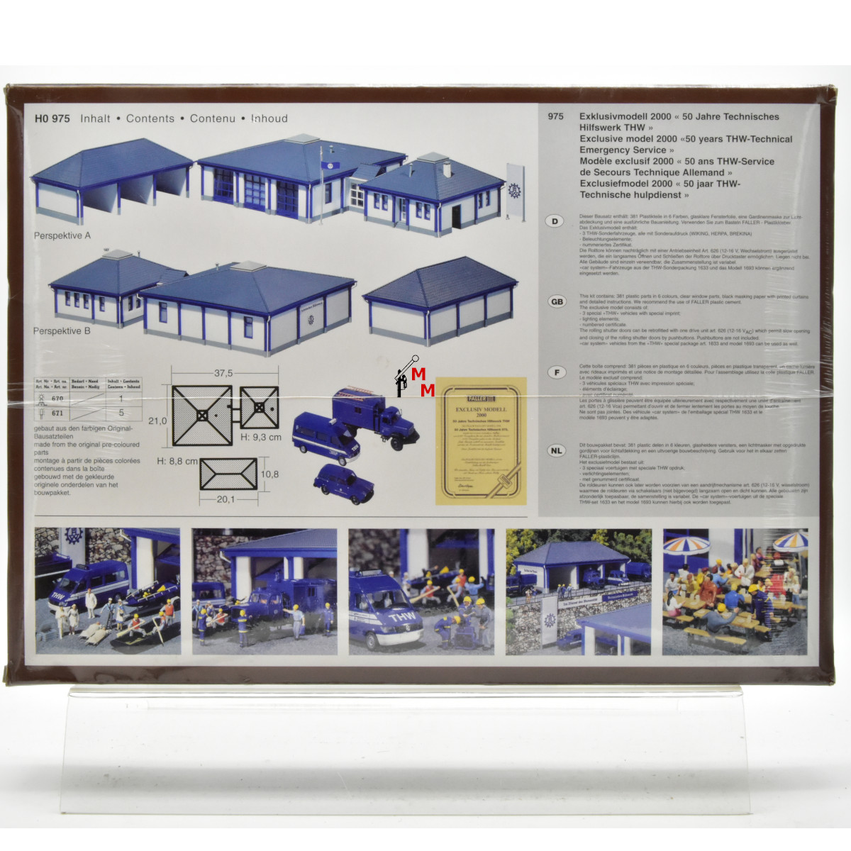 Hierbei handelt es sich um das Faller Exclusiv Modell 2000, „50 Jahre Technisches Hilfswerk THW“ bestehend aus 381 Plastikteilen in 6 Farben, glasklare Fensterfolie, eine Gardinenmaske und eine ausführliche Bauanleitung. Das Exklusivmodell enthält: 1.) drei THW-Sonderfahrzeuge (Wiking, Herpa und Brekina). 2.) Beleuchtungselemente und 3.) ein nummeriertes Zertifikat. Die Rolltore können nachträglich mit einer Antriebseinheit ausgestattet werden. Alle Gebäude sind einzeln zu verwenden und haben, fertig gebaut, folgende Maße: 37,5 x 21,0 cm; H: 9,30 cm (=großes und kleines Gebäude zusammen). 20,1 cm x 10,8 cm; H: 8,8 cm (Fahrzeughalle). Das Bausatz-Sondermodell befindet sich in neuwertigem Zustand und wird in ungeöffneter Originalverpackung geliefert. Zum Lieferumfang gehören nicht etwa abgebildete Figuren oder Accessoires. Es handelt sich hier um gebrauchte Ware, es gilt die verkürzte Gewährleistung von einem Jahr. Achtung! Nur für Erwachsene geeignet.
