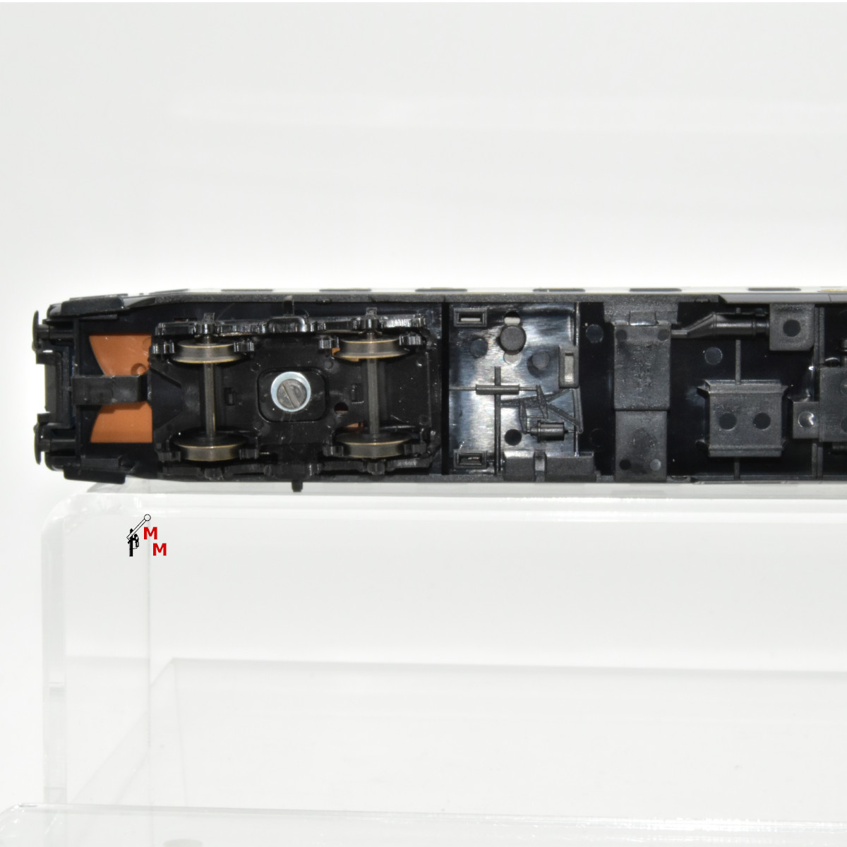 Hierbei handelt es sich um ein 4-teiliges Personenwagenset in Kunststoffausführung bestehend aus vier 4-achsigen Schlafwagen der CIWL in dunkelblauer Farbgebung mit silberfarbenem Dach. Gelbe Zierlinien und gelbe Aufschriften mit goldfarbenem CIWL-Signet. Feine Aufschriften unterhalb der Dachlinie: Compagnie Internationale des Wagons Lits et des Grands Express Europeens“. Alle Wagen mit unterschiedlichen Wagen-Nummern: 4602, 4615, 4599 und 4591 sowie mit verschiedenen UIC-Beschriftungen: 51 88 06-70 022-6, 51 88 06-70 035-8, 51 88 06-70 019-2 und 51 88 06-70 011-9. Gummiwulstübergänge und KKKulisse nach NEM. LüP.: 28 cm je Wagen. Das Wagenset ist für den Einsatz auf Gleichstromanlagen vorgesehen und befindet sich in nahezu neuwertigem Erhaltungszustand und wurde nur sehr wenig bespielt und wird in OVP mit Anleitung und Zurüstteilen in ungeöffnetem Tütchen geliefert. Minimale Spielspuren sind lediglich an den Radsätzen zu erkennen. An einem Wagen wurde ein Drehgestell mit einer Schraube befestigt. Es handelt sich hier um gebrauchte Ware, es gilt die verkürzte Gewährleistung von einem Jahr. Achtung! Nur für Erwachsene geeignet.