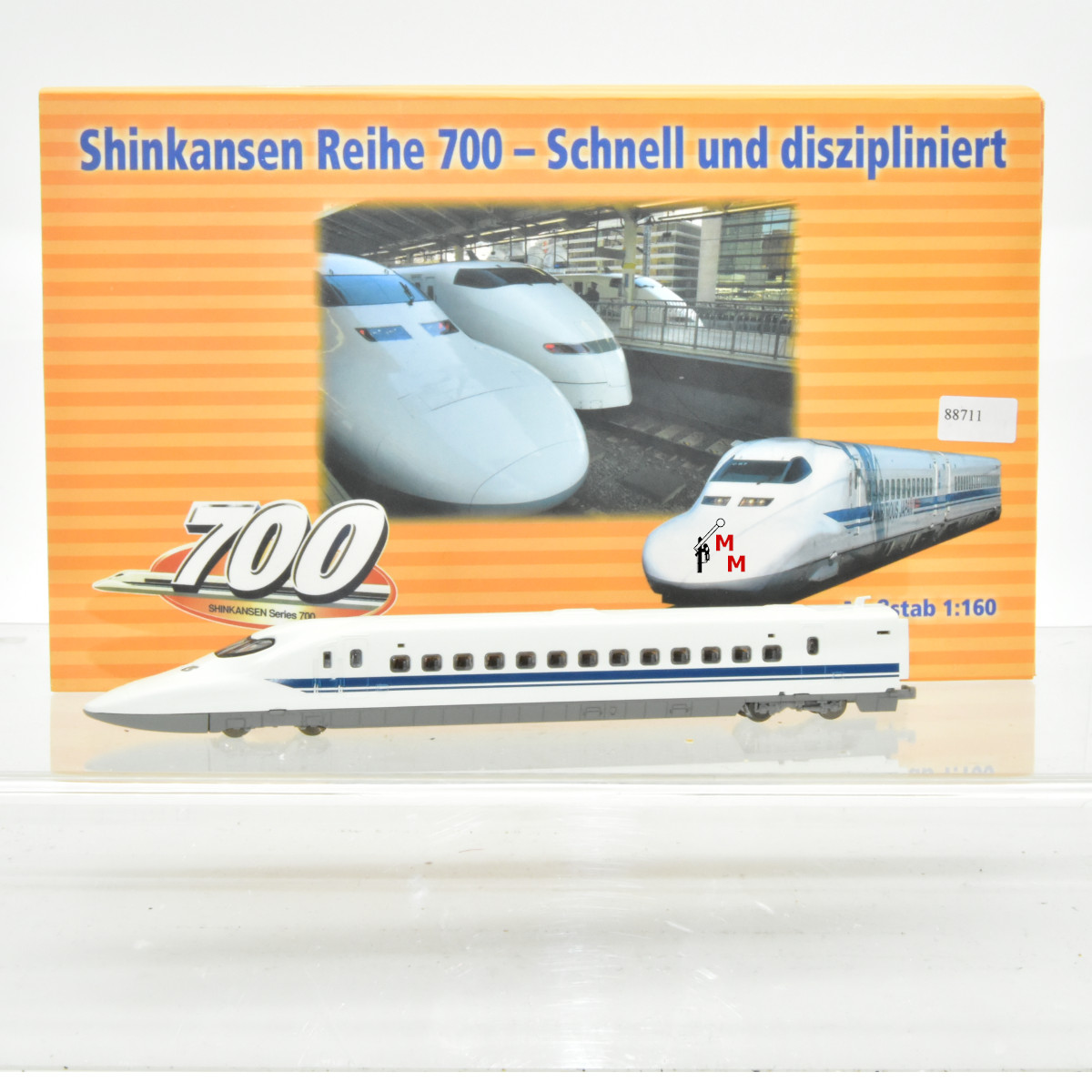 Hierbei handelt es sich um die Sammleredition „Reisen auf Schienen“ dem Modell der Reihe „Shinkansen“ 700 „Schnell und diszipliniert“ in weißer Farbgebung mit blauem Zierstreifen. Das Modell im Maßstab 1:160 ist vorbildlich dargestellt, aber ohne Motor. Bei diesem Modell handelt es sich um ein Sammler-Modell, das sich in neuwertigem Zustand befindet und in einer schönen Verpackung mit Infobroschüre geliefert wird. Es handelt sich hier um gebrauchte Ware, es gilt die verkürzte Gewährleistung von einem Jahr. Achtung! Nur für Erwachsene geeignet.