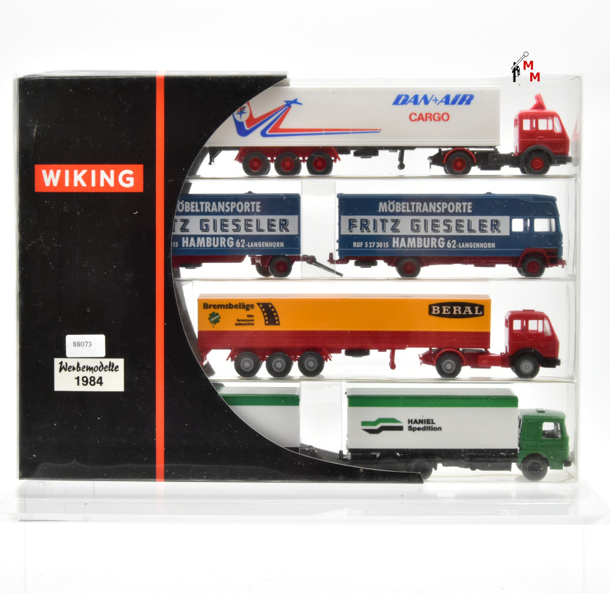 Hierbei handelt es sich um das 4-teilige Werbe-Modelle-Set 1984 bestehend aus 1.) Sattelzug Mercedes Benz „DAN + Air Cargo“ in roter Farbgebung mit Auflieger in weißer Farbgebung. 2.) Möbeltransport LKW Mercedes Benz „Fritz Gieseler“ mit 2-achsigem Anhänger in blauer Farbgebung. 3.) Pritschen-LKW Mercedes Benz „Bremsbeläge Beral“ in roter Farbgebung mit orangefarbener Plane mit Spriegel. 4.) Koffer-LKW Mercedes Benz „Haniel Spedition“ in grüner Farbgebung mit weißem Koffer. Die Modelle befinden sich in neuwertigem Zustand, sind unbespielt und werden in schöner OVP geliefert. Es handelt sich hier um gebrauchte Ware, es gilt die verkürzte Gewährleistung von einem Jahr. Achtung! Nur für Erwachsene geeignet.