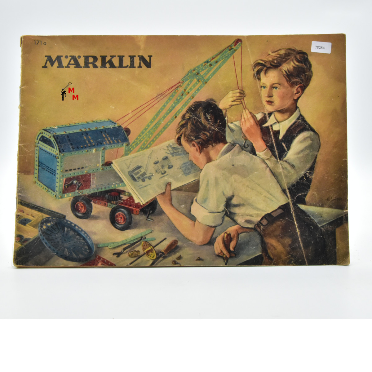 Hierbei handelt es sich um das Anleitungsheft zum Metallbaukasten. Der rechteckige Katalog hat insgesamt 52 Seiten. Ein schönes Deckblatt, dass zwei Buben beim Konstruieren zeigt, geben die Welt in den Kinderzimmern Anfang der 1960er Jahre wieder, als der Metallbaukasten von Märklin ein begehrtes Spielzeug war. Der Katalog datiert vom August 1955 und befindet sich in gutem Zustand. Das Deckblatt hat einen Knick.