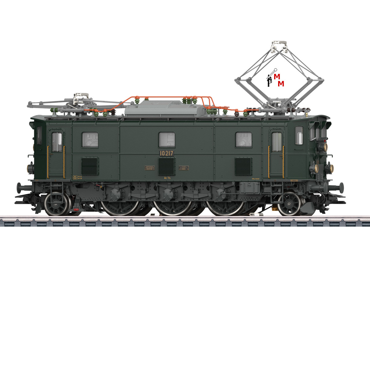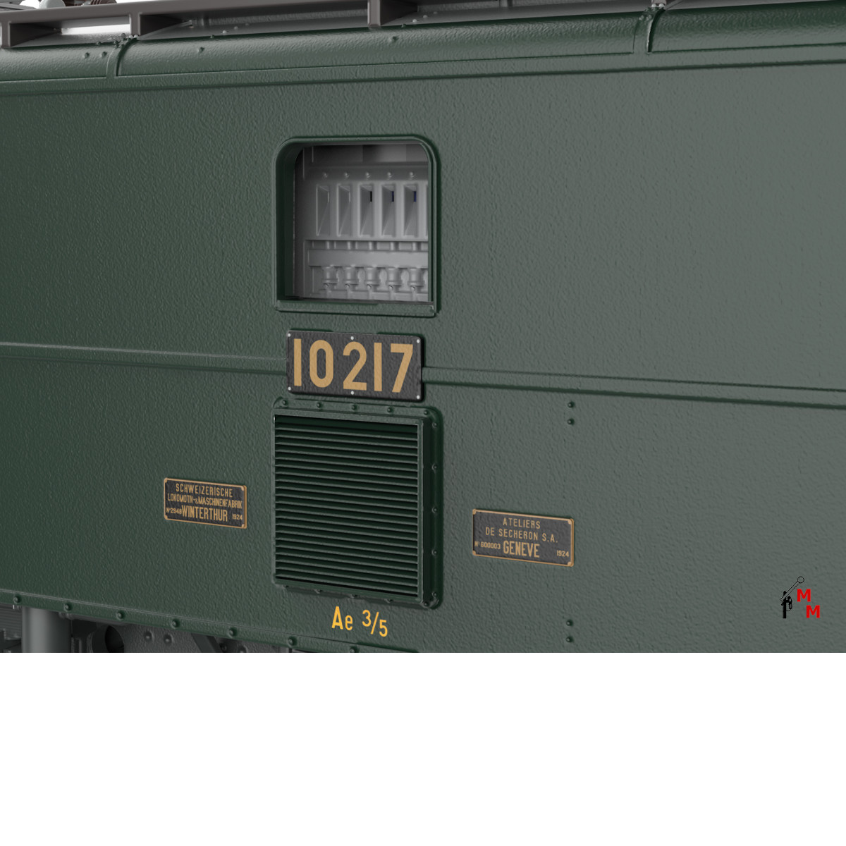 Hierbei handelt es sich um die Elektrolokomotive „Die kleine Sécheron“ in Metallausführung der Baureihe Ae 3/5 der Schweizerischen Bundesbahnen (SBB/CFF/FFS) in tannengrüner Farbgebung mit silbergrauem Dach. Dach mit Dachauf, zwei filigranen Scherenstromabnehmern und hellroten Dachleitungen mit grünen Isolatoren. Graues Fahrwerk. Modell mit stirnseitigen Übergangsblechen und Falschfahrsignal über dem oberen Spitzensignal. Messingfarbene Aufschriften mit der Lok-Betriebsnummer 10217. Betriebszustand 2022 der Epoche VI. Das Modell ist mit einem mfx+- Digital-Decoder mit umfangreichen Geräuschfunktionen und geregeltem Hochleistungsantrieb mit Schwungmasse, zentral eingebaut, ausgestattet. 1 Achsen über Kardan angetrieben. Auch lassen sich im Spielbetrieb verschiedene Modi (Halbprofi-, Profi- und Spezialisten-Modus) auslösen. Simulierter Führerstand im Display der Central Station 2 und 3 mit der Möglichkeit der Steuerung des Modells im Führerstand-Modus mittels Touchscreen der Central Station 2 und 3. So können realistische Fahreigenschaften abgebildet werden. Mit entsprechendem digitalem Fahrgerät lassen sich bis zu 28 unterschiedliche Sound- Licht- und Sonderfunktionen, wie E-Lok-Fahrgeräusch, Panto-Geräusch, Maschinenraum- und Führerstandsbeleuchtung, Lichtfunktion Falschfahrt Schweiz sowie Fahrpultbeleuchtung, Kompressor, Schienenstoß, Blitzen am Schaltwerk oder Puffer an Puffer zuschalten. Fahrtrichtungsabhängig wechselndes Dreilicht-Spitzensignal und 1 weißes Schlusslicht (Schweizer Lichtwechsel) konventionell in Betrieb, digital schaltbar. Beleuchtung umschaltbar bei Solofahrt auf 1 rotes Schlusslicht. Falschfahrsignal separat digital schaltbar. Spitzensignal an Lokseite 2 und 1 jeweils separat digital abschaltbar. Doppel-A-Licht-Funktion. Beleuchtung mit wartungsfreien warmweißen und roten Leuchtdioden (LED). Mit Pufferspeicher. Hochdetaillierte Metall-Ausführung mit vielen separat angesetzten Einzelheiten. Führerstand- und Maschinenraum-Nachbildung. Befahrbarer Mindestradius 360 mm. Bremsschläuche und Schraubenkupplungsimitationen liegen bei.