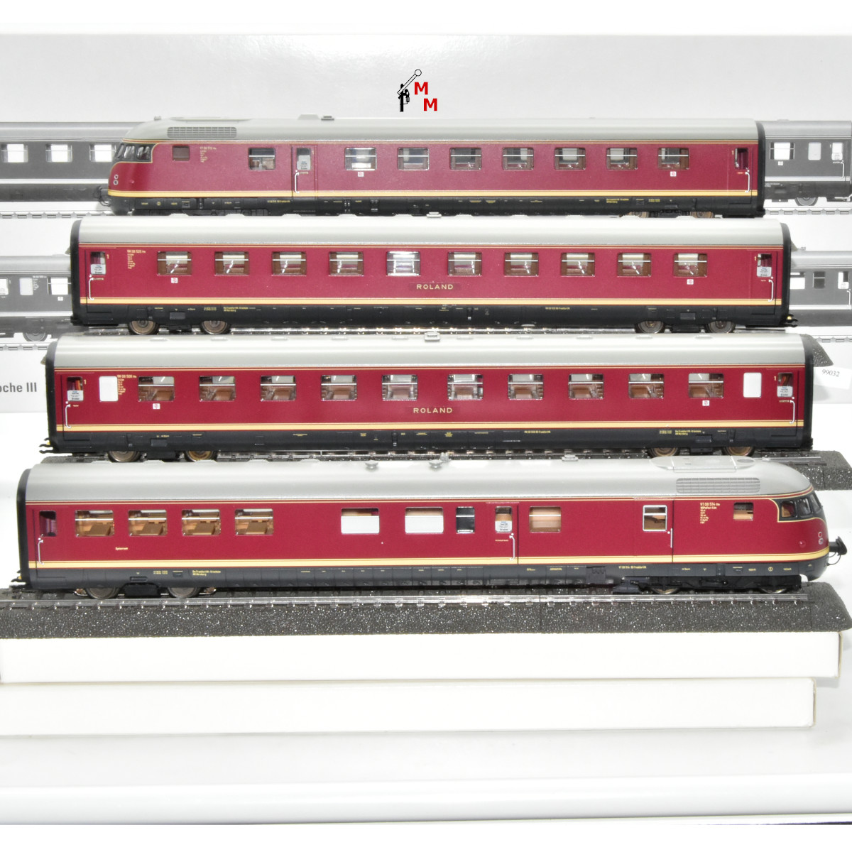 Hierbei handelt es sich um die 4-teilige Dieseltriebwagengarnitur „Roland“ in Metallausführung der Baureihe VT 08.5 der Deutschen Bundesbahn (DB-Keks) in purpurroter Farbgebung mit hellgrauen Dächern. Dunkelgrauer Zierstreifen um die Fensterfront der Triebköpfe, sowie hellbeigefarbenen Zierlinien. Modell als Zuglauf von SBB „Basel – Bremen“ im Betriebszustand um 1959. Der Triebwagenzug besteht aus einem Triebwagen VT 08.5 mit Küche und Speiseraum der Bauart WRPwPost4üm. Zwei Mittelwagen VM 08.5 mit Abteilen der Bauart A4üm sowie einem Triebwagen VT 08.5 mit Abteilen der Bauart A4üm. Das Modell ist mit einem mfx-Digital-Decoder mit umfangreichen Soundfunktionen und mit geregeltem Hochleistungsantrieb Softdrive Sinus, wartungsfreier Motor in kompakter Bauform, ausgestattet. Im Digitalbetrieb lassen sich das Spitzensignal mit warmweißen LED, Diesellok-Fahrgeräusch, Signalhorn, Schaffnerpfiff u.v.m. schalten. Dieseltriebzug mit Innenbeleuchtung und Führerstandbeleuchtung. Die Triebköpfe und Mittelwagen lassen sich komfortabel mit kurz gekuppelten Spezialverbindungen zusammenfügen. Gesamtlänge: 123,8 cm. Der Triebwagenzug wurde 2010 als Einmalserie gefertigt und befindet sich in nahezu neuwertigem Zustand, wurde sehr wenig bespielt und wird in schöner OVP mit Anleitung geliefert. Minimale Spielspuren sind nur an den Radsätzen zu erkennen. Es handelt sich hier um gebrauchte Ware, es gilt die verkürzte Gewährleistung von einem Jahr. Achtung! Nur für Erwachsene geeignet.