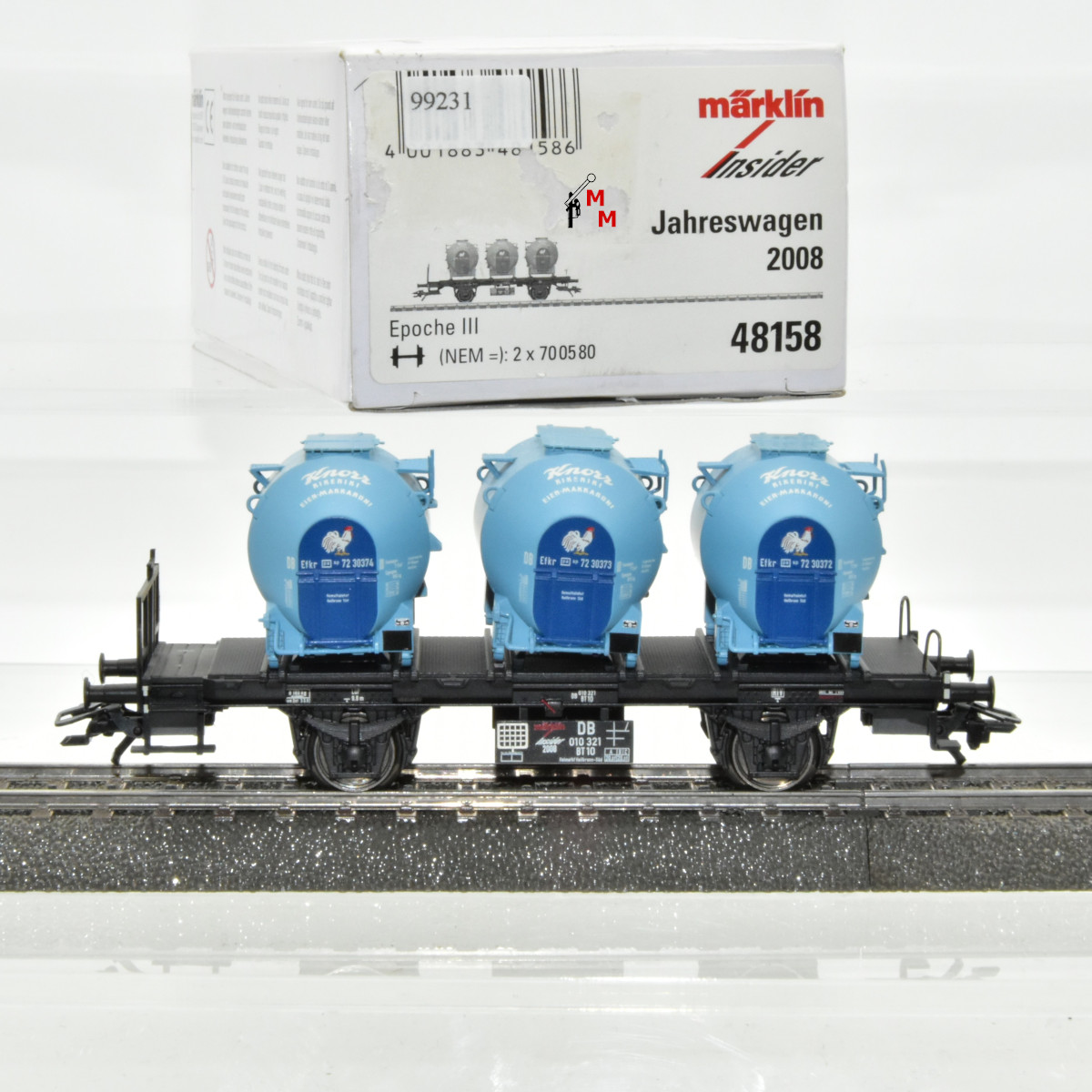 Hierbei handelt es sich um einen 2-achsigen Behältertragwagen in Kunststoffausführung Typ BT 10 der Deutschen Bundesbahn in schwarzer Farbgebung. Beladen ist das Modell mit 3 Pa-Behältern für Feinschüttgut Typ Efkr „Von Haus zu Haus“ in hellblauer Farbgebung. Einseitig Bremserbühne, Gattungsschild mit der Wg.-Nr.: 010 321. Die abnehmbaren Behälter tragen die weiße Aufschrift: „Knorr Kikeriki Eier-Makkaroni“, jeder Behälter hat eine andere Behälter-Nummer und die farbige Abbildung eines Hahns. LüP 11,4 cm. Der Wagen wurde 2008 für die Mitglieder des Märklin-Insider-Clubs als einmalige Serie gefertigt und befindet sich in neuwertigem Zustand, ist unbespielt und wird in OVP geliefert. Auf einer Schmalseite der Verpackung befindet sich eine größere Beschädigung verursacht durch das unsachgemäße Entfernen eines Klebeetiketts. Es handelt sich hier um gebrauchte Ware, es gilt die verkürzte Gewährleistung von einem Jahr. Achtung! Nur für Erwachsene geeignet.
