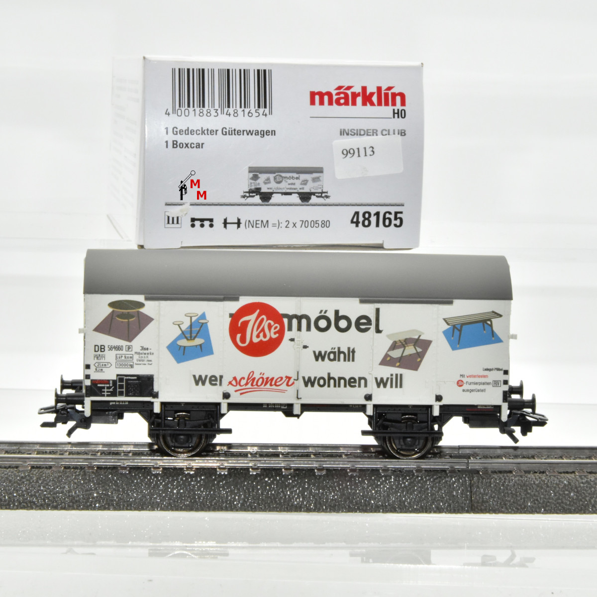 Hierbei handelt es sich um einen 2-Achsigen gedeckten Güterwagen in Kunststoffausführung der Deutschen Bundesbahn in weißer Grundfarbgebung mit grauem Dach. Zwei angesetzte Tritte unterhalb der Schiebetüren. Modell im Design der Ilse Möbelwerke GmbH mit einigen farbigen Abbildungen und der Aufschrift: „Ilse Möbel wählt wer schöner wohnen will“. Weiter schwarze Aufschriften mit der Wg.-Nr.: 564 660. Weiße Rahmenaufschriften. KKKulisse. LüP.: 11,0 cm Bei dem Modell handelt es sich um den Jahreswagen des Insider Clubs 2015. Das Modell befindet sich in neuwertigem Zustand, ist unbespielt und wird in schöner OVP geliefert. Es handelt sich hier um gebrauchte Ware, es gilt die verkürzte Gewährleistung von einem Jahr. Achtung! Nur für Erwachsene geeignet.