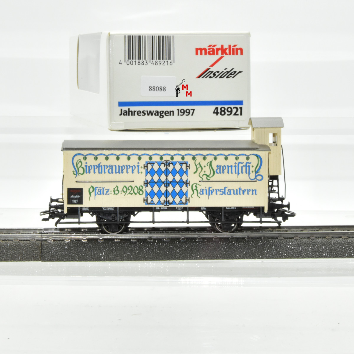 Hierbei handelt es sich um einen 2-achsigen Kühlwagen, Länderbahntyp in Kunststoffausführung in hellbeigefarbener Farbgebung mit dunkelgrauem Dach. Hochstehendes Bremserhaus mit rundem Dach. Farbige Aufschriften: „Bierbrauerei Jaenisch, Pfalz, Kaiserslautern“. Türen mit blau-weißem Rautenmuster. Weiße Rahmenaufschriften mit der Wg.-Nr.: 9208. Speichenräder. Der Wagen wurde 1997 im Rahmen der Insider-Mitgliedschaft für den Insider gefertigt und befindet sich in neuwertigem Zustand, ist unbespielt und wird in schöner OVP geliefert. Es handelt sich hier um gebrauchte Ware, es gilt die verkürzte Gewährleistung von einem Jahr. Achtung! Nur für Erwachsene geeignet.