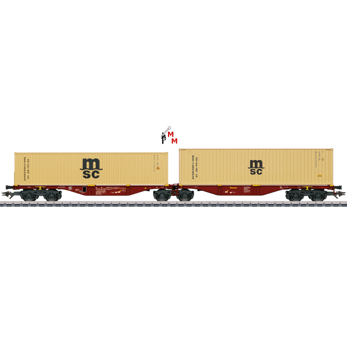 Hierbei handelt es sich um einen 6-achsigen Doppel-Containertragwagen mit Gelenk in weitestgehend Metallausführung der Bauart Sggrss 80 für den kombinierten Ladungsverkehr als Privatwagen der Firma Touax Rail Ltd., registriert in Belgien in oxidroter Grundfarbgebung Betriebszustand 2009. Beladen mit einem 40-ft. High-Cube Boxcontainer und einem normal hohen 40-ft. Boxcontainer in farbiger Gestaltung der MSC. Tragwagen mit vorbildgerecht durchbrochenen Tragwagen-Böden aus Metall, mit markanten fischbauchartigen Außenlangträgern. Drehgestelle Typ Y 25. Beide Tragwagen-Hälften liegen beweglich gelagert auf dem mittleren Drehgestell auf. Unterseite der Tragwagen-Böden mit angesetzten Bremsleitungen und Luftbehältern. Klappbare Übergänge an der Oberseite der Tragwagen-Böden über dem mittleren Drehgestell im Gelenk-Bereich. Separat angesetzte Haltestangen an den Wagenenden und Rangierhaken. Dieser moderne Gütertransportwagen eignet sich besonders als Ganzzüge im Seehafen-Hinterlandverkehr. LüP.: 30,7 cm. Es handelt sich um eine Einmalserie für 2025 und um Neuware mit 2 Jahren Herstellergarantie. Achtung! Nur für Erwachsene geeignet.
