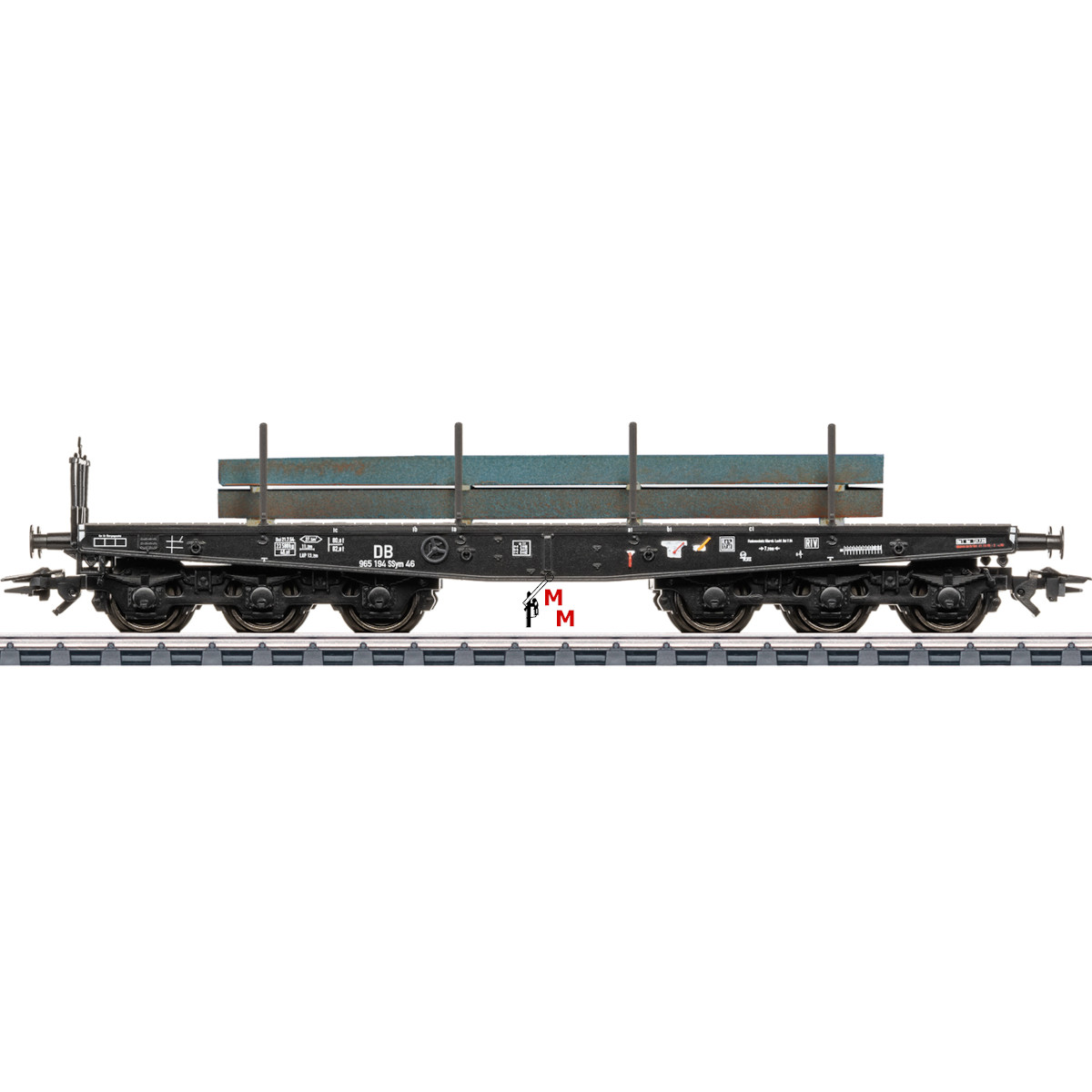 Hierbei handelt es sich um einen 6-achsigen Schwerlast-Flachwagen in Metallausführung der Bauart SSym 46 der Deutschen Bundesbahn in tiefschwarzer Grundfarbgebung mit weißen Aufschriften mit der Wg.-Nr.: 965 194. Betriebszustand ab Mitte der 1950er-Jahre der Epoche III. Der Schwerlast-Wagen ist beladen mit Stahlbrammen. Einsteckbare Rungen liegen bei. Länge über Puffer 15,2 cm. Bei diesem Wagen handelt es sich um eine Einmalserie 2026 und um Neuware mit zwei Jahren Herstellergarantie. Achtung! Nur für Erwachsene geeignet.