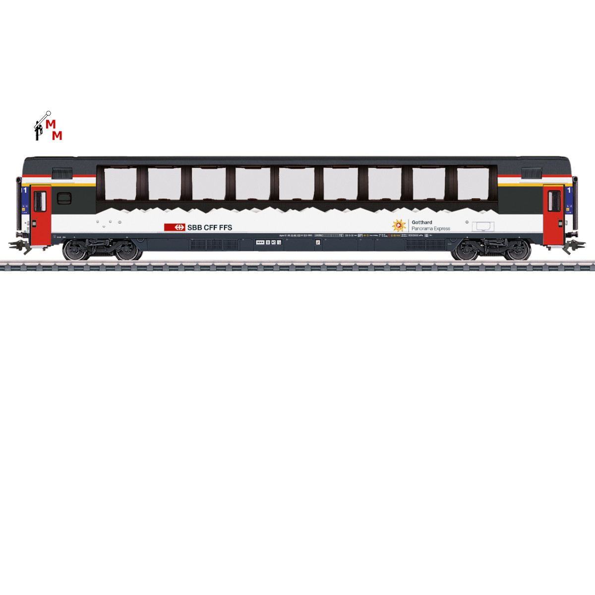 Hierbei handelt es sich um einen Schnellzug-Panoramawagen in Kunststoffausführung der Bauart Apm der 1. Klasse, der Schweizerischen Bundesbahnen (SBB/CFF/FFS) in weiß-dunkelgrauer Farbgebung und rot akzentuierten Einstiegstüren. Längsseiten mit farbigem Signet „Gotthard Panorama Express“. Betriebszustand 2025 der Epoche VI.Verstellbare Puffer. Vorbereitet für Strom führende Kupplungen 7319 oder Strom führende trennbare Kurzkupplungen 72020/72021 sowie zum Einbau einer Innenbeleuchtung 7316. Länge über Puffer ca. 26,7 cm. Die passende Lokomotive hat die Artikel-Nummer 39469. Bei diesem Schweizer Personenwagen in neuem Design handelt es sich um eine Einmalserie 2026 und um Neuware mit 2 Jahren Herstellergarantie. Achtung! Nur für Erwachsene geeignet.