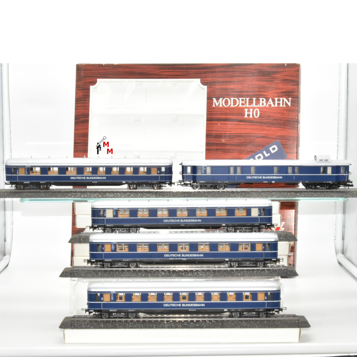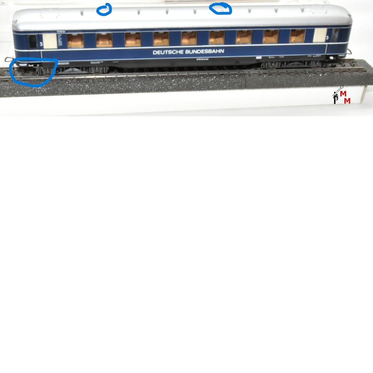 Hierbei handelt es sich um das 5-teiliges Schürzenwagenset „Rheingold 1952“ der Epoche III in Kunststoffausführung bestehend aus unterschiedlichen 4-achsigen Schürzenwagen der Deutschen Bundesbahn und einem 4-achsigen Bahnpostwagen. Alle Wagen mit Inneneinrichtung. 1.) Schürzenwagen Typ ABC4üwe der 1./2./3. Klasse in blauer Farbgebung mit silberfarbenem Dach, silberfarbenen Zierstreifen. Dach mit 8 Lüftern. Wg.-Nr.: 214 007. LüP.: 240 mm 2.) Schürzenwagen Typ A4üe der 1. Klasse in blauer Farbgebung mit silberfarbenem Dach, silberfarbenen Zierstreifen. Dach mit 7 Lüftern. Wg.-Nr.: 11 702. LüP.: 247 mm 3.) Schürzenwagen Typ ABüe der 1./2. Klasse in blauer Farbgebung mit silberfarbenem Dach, silberfarbenen Zierstreifen. Dach mit 7 Lüftern. Wg.-Nr.: 11686. LüP.: 240 mm. 4.) Schürzenwagen Typ C4üwe der 3. Klasse in blauer Farbgebung mit silberfarbenem Dach, silberfarbenen Zierstreifen. Dach mit 9 Lüftern. Wg.-Nr.: 19516. LüP.: 240 mm. 5.) Gepäckwagen Typ Pw4üe in dunkelblauer Farbgebung mit silberfarbenem Dach. Dach mit Dachaufbau. Wg.-Nr.: 105567. LüP.: 257 mm. Die Wagen sind mit Wechselstromachsen ausgestattet und befinden sich in gutem bis sehr gutem Zustand, wurden bespielt und werden in OVP geleifert. Minimale Spielspuren sind an den Radsätzen zu erkennen. Am Wagen der 3. Klasse sind am Dach zwei Lüfter abgebrochen. Ebenso ist eine Treppe abgebrochen. Am Wagen der 1./2./3. Klasse fehlt eine Kupplung. Der Gepäckwagen gehört nicht zum werksseitigen Auslieferungszustand dieser Wagenpackung. Dieser Wagen hat einen Normschacht und ist mit unterschiedlichen Kupplungen ausgestattet. Der Wagenkasten des 1./2. Klasse Wagens schließt auf einer Längsseite nicht korrekt mit dem unteren Wagenteil. Es handelt sich hier um gebrauchte Ware, es gilt die verkürzte Gewährleistung von einem Jahr. Achtung! Nur für Erwachsene geeignet.