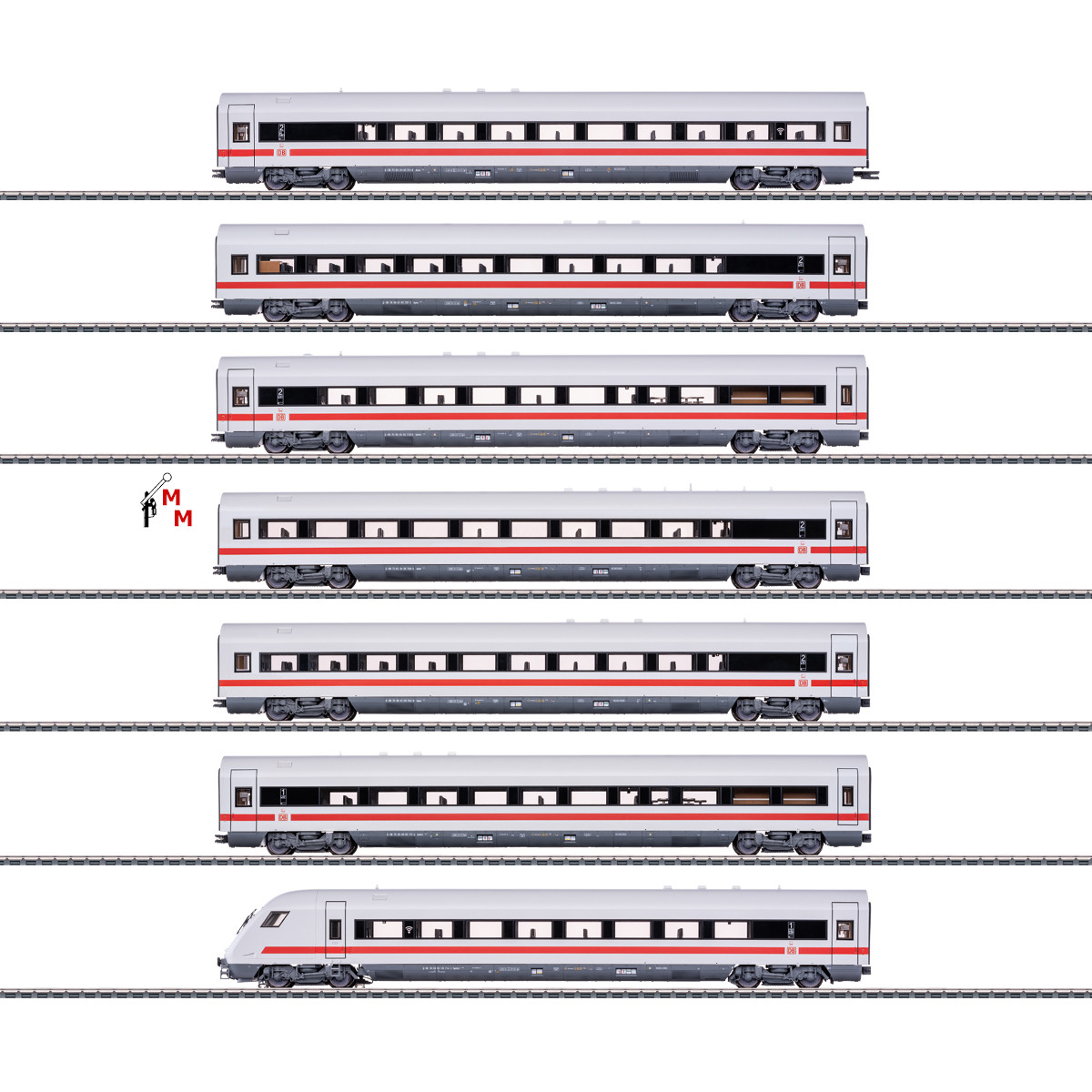 Hierbei handelt es sich um das 7-teilige ICE-Schnellzugwagen-Set „der noble ICE“ in Kunststoffausführung in typischer Farbgebung für den Zuglauf Köln – Berlin Ostbahnhof bestehend aus IC/ICE Reisezugwagen unterschiedlicher Bauarten 1.) Schnellzugwagen der Bauart Apmz 116.0 der 2. Klasse mit der Ordnungsnummer 1. 2.) Schnellzugwagen der Bauart Apmz 116.1 der 2. Klasse mit der Ordnungsnummer 2. 3.) Schnellzugwagen der Bauart Apmkz 116.6 der 2. Klasse mit der Ordnungsnummer 3. 4.) Schnellzugwagen der Bauart Apmz 116.4 2. Klasse mit der Ordnungsnummer 4. 5.) Schnellzugwagen der Bauart Apmz 116.2 der 2. Klasse mit der Ordnungsnummer 5. 6.) 4-achsiger Schnellzugwagen der Bauart Apmkz 116.6 der 1. Klasse mit der Ordnungsnummer 6. 7.) Schnellzug-Steuerwagen der Bauart Apmbzf 116.8 der 1. Klasse mit der Ordnungsnummer 7. Alle Wagen sind mit serienmäßig eingebauter indirekter LED-Innenbeleuchtung, dimmbar und digital schaltbar über Decoder im Steuerwagen ausgerüstet. Mit Pufferkondensatoren zur Überbrückung kurzer Stromloser Stellen. Im Steuerwagen ist ein mfx-Digital-Decoder verbaut. Dreilicht-Spitzensignal und zwei rote Schlusslichter konventionell in Betrieb, digital schaltbar. Fernlicht, Führerstandbeleuchtung und Fahrpult-Beleuchtung im Steuerwagen jeweils separat digital schaltbar. Die Strom führenden 4-poligen Kupplungen zwischen den Schnellzugwagen sorgen für vorbildliche Beleuchtung mit wartungsfreien warmweißen und roten Leuchtdioden (LED) in Lokomotive und Wagen. Am Wagen mit der Ordnungsnummer 1 ist eine 2-polige Kupplung eingesteckt. Die Wagen überzeugen mit mehrfarbiger Inneneinrichtung. Für die volle Funktionsfähigkeit des ganzen Zuges ist eine definierte Fahrzeugreihenfolge vorgegeben. Der Wagen 1 mit Gummiwulst-Übergang in detaillierter Darstellung ist zur Lokomotive zu richten. Schleiferumschaltung zwischen Lokomotive und Steuerwagen. Befahrbarer Mindestradius 360 mm, ohne Beachtung des Lichtraum-Profils. Für größere Radien kann im Bereich der Kupplungen an den Wagen-Enden jeweils die serienmäßig montierte gegen eine separat beiliegende Schürze getauscht werden. Gesamtlänge der Zug-Garnitur über Puffer ca. 214 cm. Um dieses Schnellzugwagenset in Einsatz zu bringen, ist die Lokomotive der BR 101 (39478) notwendig. Bei diesem Modell handelt es sich um eine Einmalserie 206 und um Neuware mit 2 Jahren Herstellergarantie. Achtung! Nur für Erwachsene geeignet.