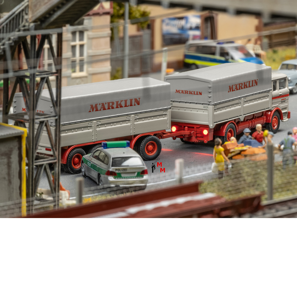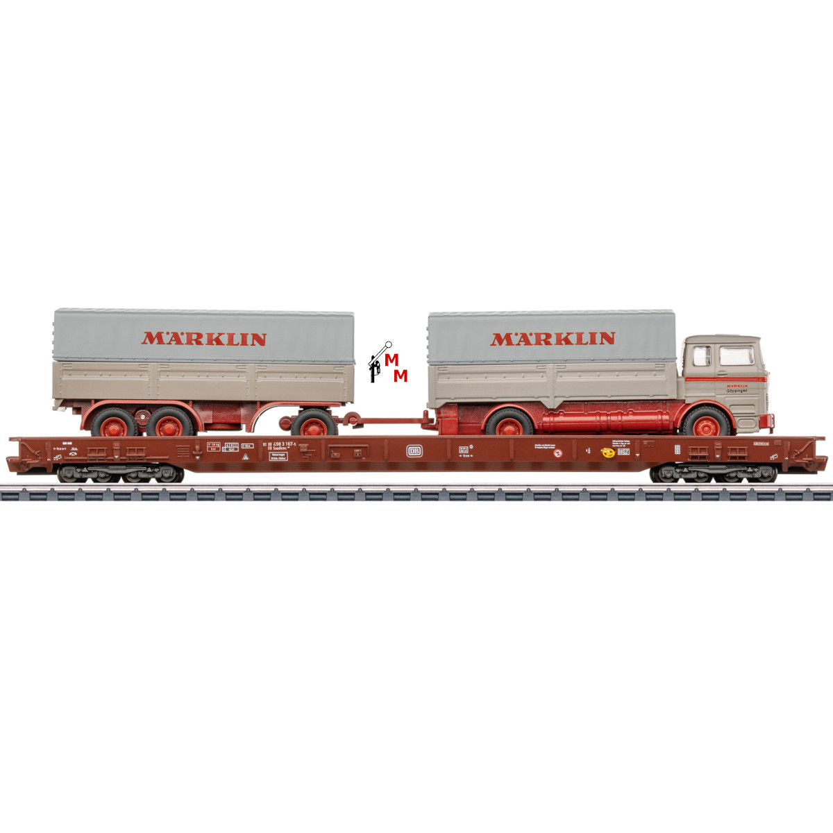 Hierbei handelt es sich um einen 8-achsigen Niederflurwagen in Metallausführung der Bauart Saadkms 690 der Deutschen Bundesbahn (DB-Keks) in rotbrauner Farbgebung für den Wagenverband "Rollende Landstraße" als Spezialwagen für den Transport von Straßenfahrzeugen. Haltekeil für LKW-Modelle und Sonderkupplung für Niederflurwagen liegen bei. Beladen ist der Niederflurwagen mit einem ferngesteuerten Modell eines LKW MB 1620 Plane mit Anhänger "Märklin" in typischer Epoche IV-Gestaltung. Der Lastwagen entstand in Zusammenarbeit mit der Fa. Carson und lässt sich mittels beigefügter Fernsteuerung (batteriebetrieben) der Firma CARSON über die Anlage Steuern. Dazu gibt es passenden LKW-Sound und verschiedene Lichtfunktionen. Länge über Puffer 23,2 cm. Das Modell garantiert hohen Spielspaß und wird als Einmalserie 2026 gefertigt. Es handelt sich um Neuware mit 2 Jahren Herstellergarantie. Achtung! Nur für Erwachsene geeignet.