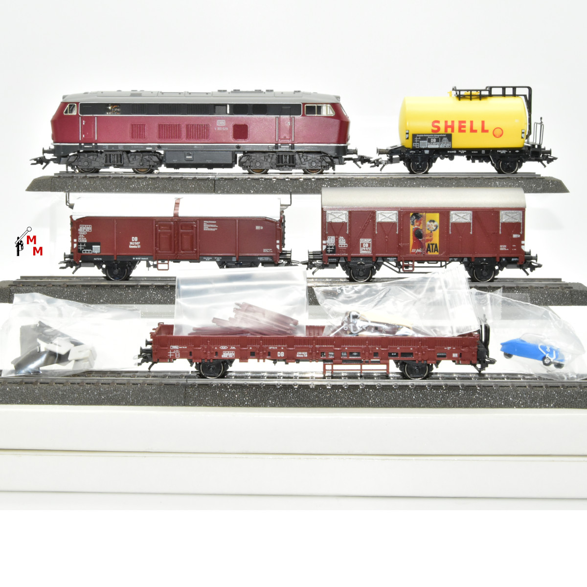 Hierbei handelt es sich um den Güterzug aus dem Premium-Startset bestehend aus 1.) 4-achsige Diesellokomotive in Kunststoffausführung der Baureihe V 160 der Deutschen Bundesbahn (DB-Keks) in dunkelrot-grauer Farbgebung mit grauem Dach. Beidseitig 3 Stirnlampen, Lampengrill und Zierlinien silberfarben. Hellgraue Aufschriften mit der Betr.-Nr.: V 160 029. Die Lokomotive ist bereits werksseitig mit einem Digitaldecoder und Hochleistungsantrieb ausgestattet. Druckluftpfeife, Spitzensignal und Direktsteuerung lassen sich mit entsprechendem digitalem Steuergerät zuschalten. Anfahr- und Bremsverzögerung sowie Lastenausgleich ist ebenfalls digital steuerbar. 2.) 2-achsiger gedeckten Güterwagen in Kunststoffausführung der Bauart Gamms 44 der Deutschen Bundesbahn in brauner Farbgebung mit silberfarbenem Dach. Silberfarbenen akzentuiert Fenstereinsätze. Mittig angeordnet ein farbiges Werbeschild mit der Aufschrift: „so putzt ATA“. Weiße Aufschriften mit der Wg.-Nr.: 270 571. Weiße Rahmenaufschriften. KKKulisse. Geschwärzte Räder. 3.) 2-achsiger Kesselwagen in Einheitsbauart als Privatwagen der Shell-AG eingestellt bei der Deutschen Bundesbahn. Modell mit gelbem Kessel und roter Aufschrift: „Shell“. Angesetztes Gattungsschild mit weißer Aufschrift und er Wg.-Nr.: 542 207. 4.) 2-achsiger Schiebedachwagen der Bauart Kmmks 51 der Deutschen Bundesbahn in rotbrauner Farbgebung mit silberfarbenem Dach. Weiße Aufschriften mit der Wg.-Nr.: 362 507. 5.) 2-achsiger Rungenwagen der Bauart Rlmms 58 in rotbrauner Farbgebung. Weiße Aufschriften mit der Wg.-Nr.: 450 820. Diesellokomotive und Güterwagen befinden sich in sehr gutem nahezu neuwertigem Zustand, nur die Lokomotive wurde bespielt. Minimale Spielspuren sind nur an den Radsätzen und dem Schleifer der Lokomotive zu erkennen. Am Dach der Diesellokomotive ist ein kleinerer Kratzer vorhanden. Hier scheint die dunkle Grundfarbgebung durch. Die Lieferung erfolgt in Styroporeinsatz des Startsets für eine BR 216. Die Anleitung steht als E-Mail-Anhang zur Verfügung. Die beiden Automodelle und die Rungen für den Rungenwagen liegen bei. Die Angabe -02 in der Artikel-Nummer ist eine erdachte Nummer und bedeutet keineswegs eine Stückzahl. Es handelt sich hier um gebrauchte Ware, es gilt die verkürzte Gewährleistung von einem Jahr. Achtung! Nur für Erwachsene geeignet.