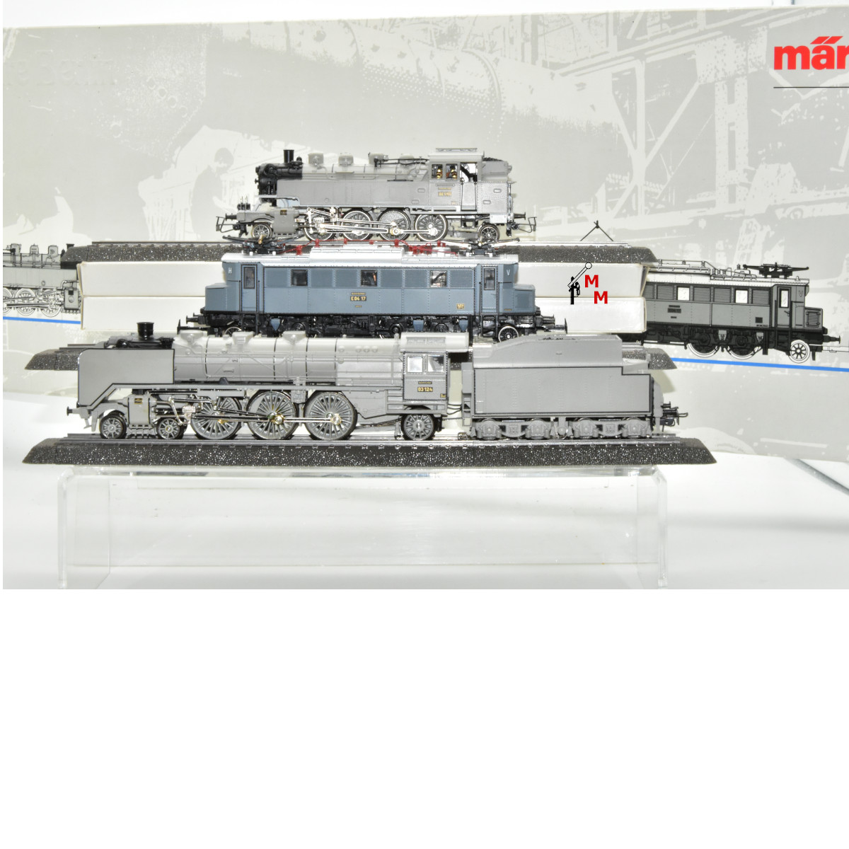 Hierbei handelt es sich um die Lokomotiv-Packung „750 Jahre Berlin“ bestehend aus drei Lokomotiven und verkleinerte Replikate der Fabrikschilder sowie eine Broschüre. 1.) Elektrolokomotive in Kunststoffausführung der Baureihe 04 der Deutschen Reichsbahn in blaugrauer Farbgebung (Fotografieranstrich) mit silberfarbenem Dach. Dach mit zwei Scherenstromabnehmern, dunkelroter Dachleitung und dunkelroter Isolatoren. DR in blaugrauer Farbgebung (Fotografieranstrich). Beidseitig 3 Stirnlampen. Messingfarbene Aufschriften mit der Betr.-Nr.: E 04 17, 2.) Schlepptenderlokomotive in Guss/Kunststoffausführung der Baureihe 03 der Deutschen Reichsbahn in grauer Farbgebung (Fotografieranstrich) mit großen Windleitblechen der Bauart Wagner. Schwarze Kesselfront. 3 Stirnlampen. Messingfarbene Aufschriften mit der Betr.-Nr.: 03 124. Der 4-achsige Nietentender ist in Kunststoffausführung. 3.) Tenderlokomotive in Kunststoffausführung der Baureihe 86 der Deutschen Reichsbahn in grauer Farbgebung (Fotografieranstrich) mit schwarzer Kesselfront. Beidseitig 3 Stirnlampen. Modell ohne Telexkupplung. Messingfarbene Aufschriften mit der Betr.-Nr.: 86 090. Alle Lokomotiven sind für den konventionellen Betrieb vorgesehen und befinden sich in nahezu neuwertigem Zustand, wurden sehr wenig bespielt und werden in schöner OVP mit Anleitung, Infobroschüre und Original-Fabrikschildern als Metall-Repliken geliefert. Minimale Spielspuren sind nur an den Schleifern zu erkennen. An der Tenderlokomotive ist eine schwarze Dachleitung mittig gebrochen. Dies ist eher unauffällig. Es handelt sich hier um gebrauchte Ware, es gilt die verkürzte Gewährleistung von einem Jahr. Achtung! Nur für Erwachsene geeignet.